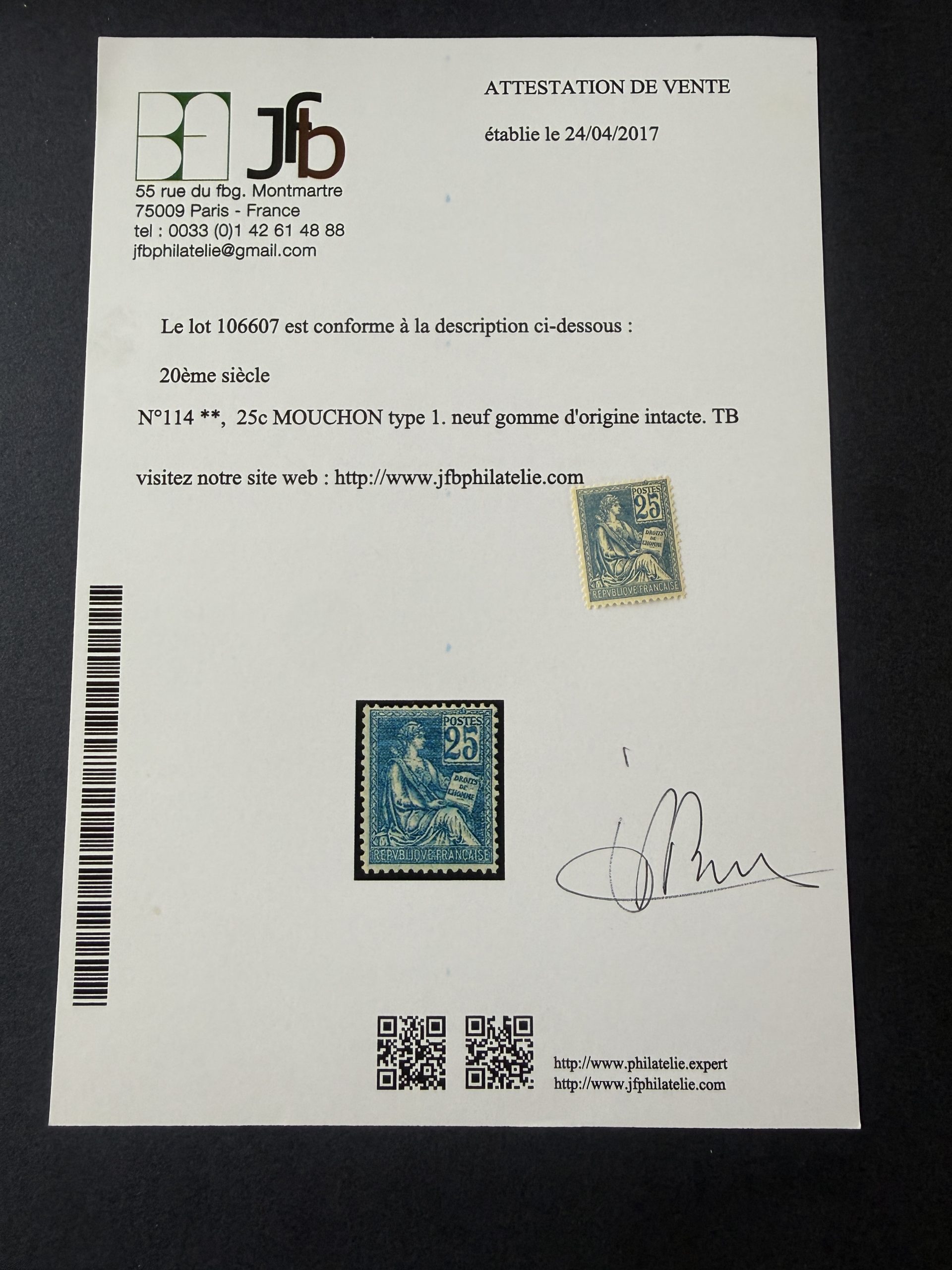 Timbre(s) en état TB, voir photos. Certificat Brun.