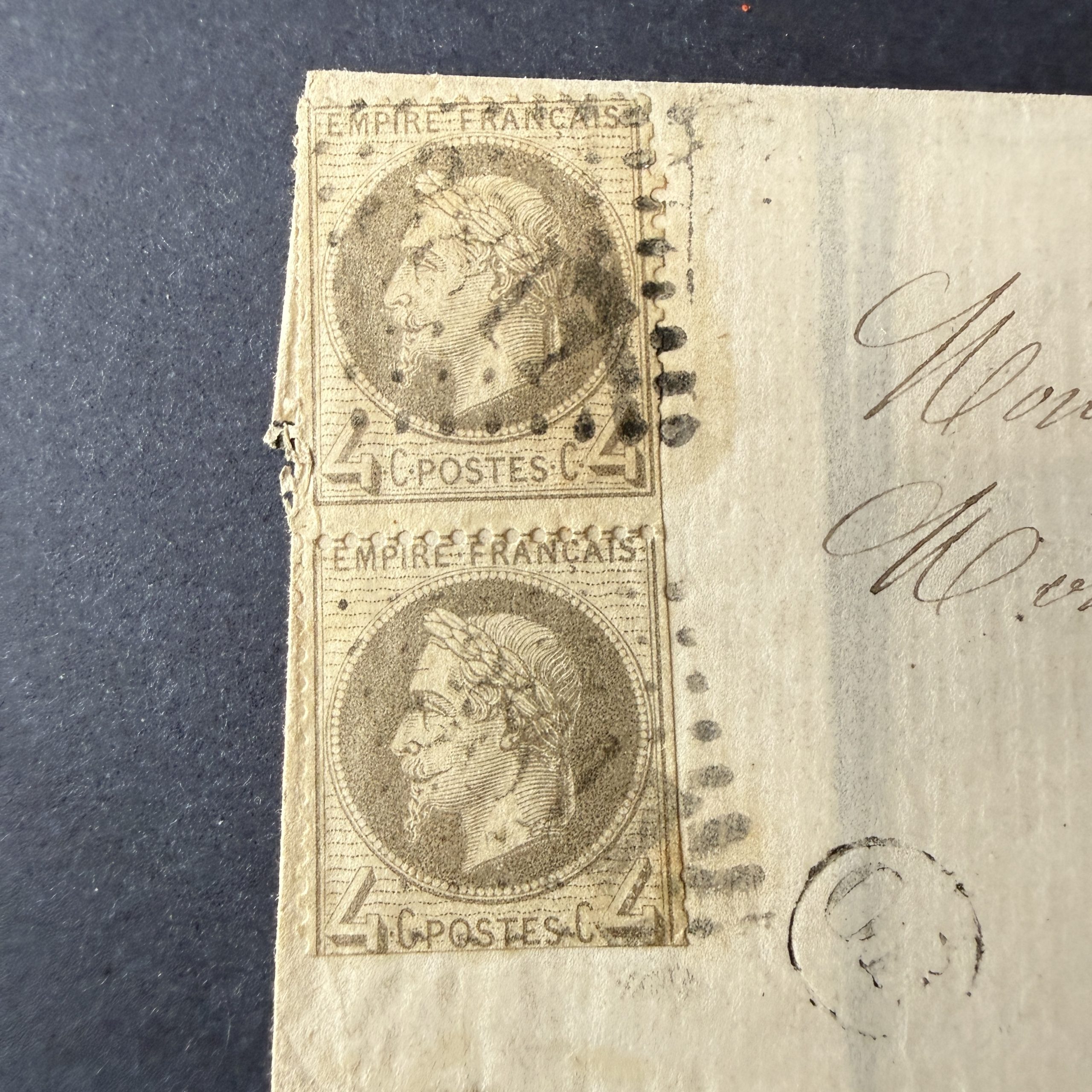 Nous proposons le(s) timbre(s) Y&T 27 (paire + 2 exemplaires) « Napoléon lauré 4c » sur lettre.