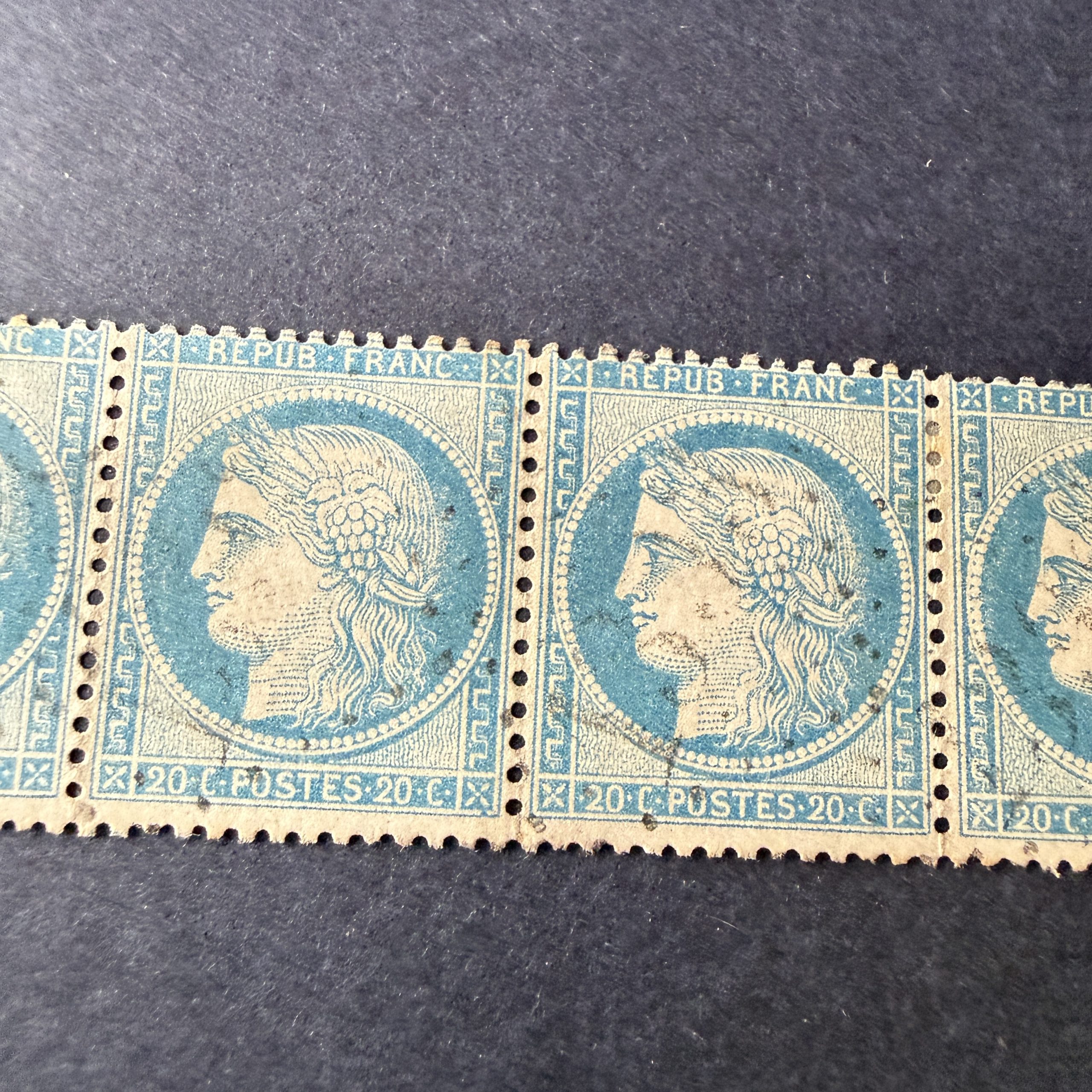 Nous proposons le(s) timbre(s) Y&T 37 « Cérès siège 20c bleu » bande de 5 en oblitéré.