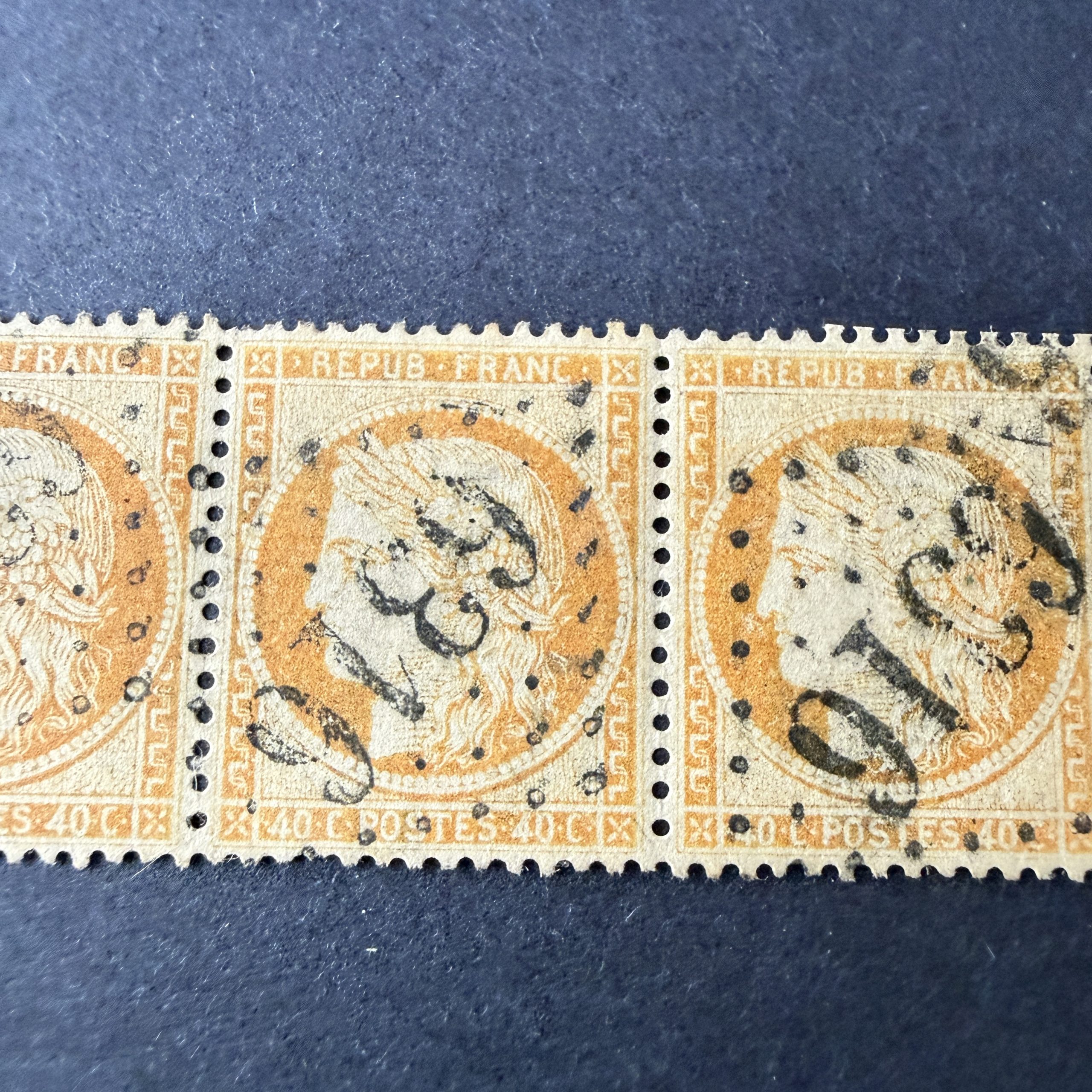 Nous proposons le(s) timbre(s) Y&T 38 « Cérès siège 40c orange » bande de 6 en oblitéré.