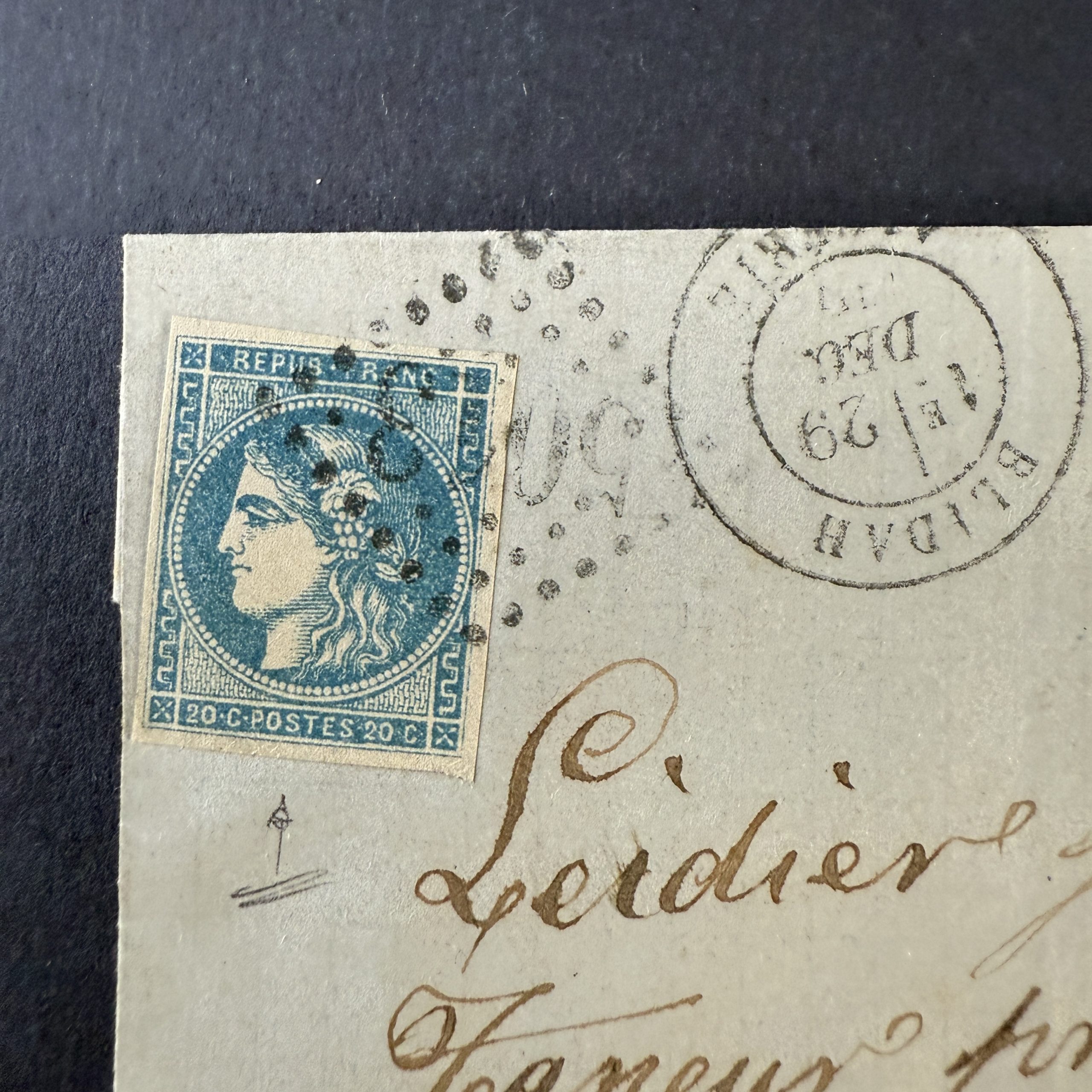 Timbre(s) en état TB, voir photos. Superbe lettre et frappe GC du bureau de Blidah. Le timbre possède un « oeil noir ».